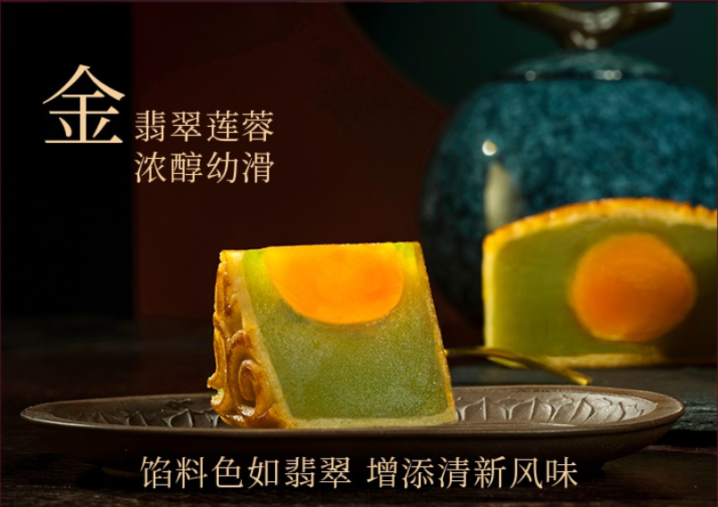 - 独特口味:元朗荣华蛋黄金翡翠月饼的饼皮金黄,甘沙蛋黄饱满鲜香,添加螺旋藻后,馅料呈现出如翡翠般的颜色,不仅养眼,而且口感独特。